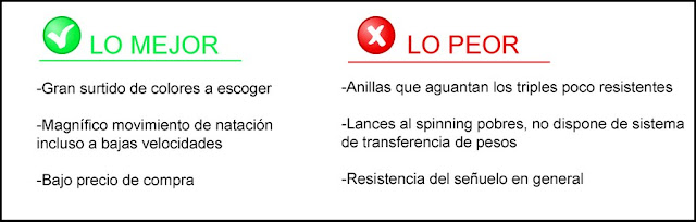 Como todo señuelo tiene sus puntos fuertes y sus puntos débiles, aún más teniendo en cuenta que se trata de un señuelo de bajo coste. Pues hablemos un poco de él;